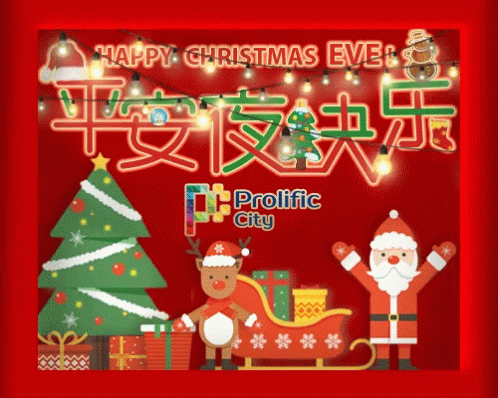 Festive Christmas Eve greeting with Santa, reindeer, Christmas tree, and gifts, featuring text in English and Chinese.