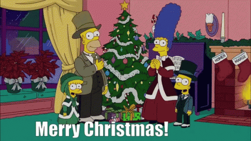 Homer, Marge, Bart, and Lisa Simpson celebrate Christmas in Victorian attire around a festive tree.