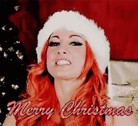 WWE superstar Becky Lynch, wearing a Santa hat, wishes "Merry Christmas" as confetti falls around her.