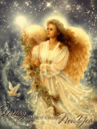 An ethereal angel with golden wings holds a staff, wishing 'Merry Christmas and a Happy New Year' on a festive greeting card.