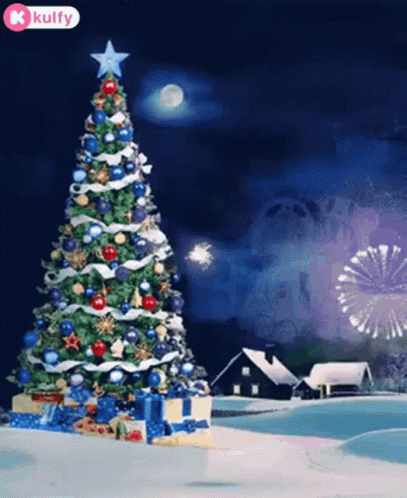 A beautifully decorated Christmas tree with gifts and fireworks under a full moon in a snowy landscape.