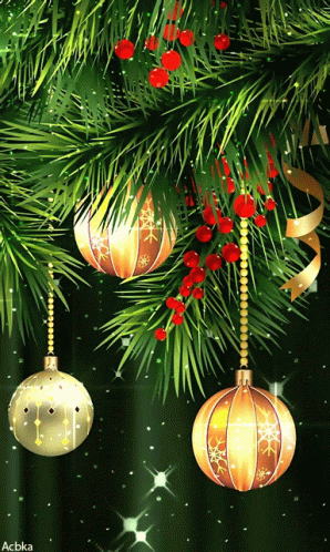 Festive Christmas tree branches adorned with golden ornaments, red berries, and sparkling lights.