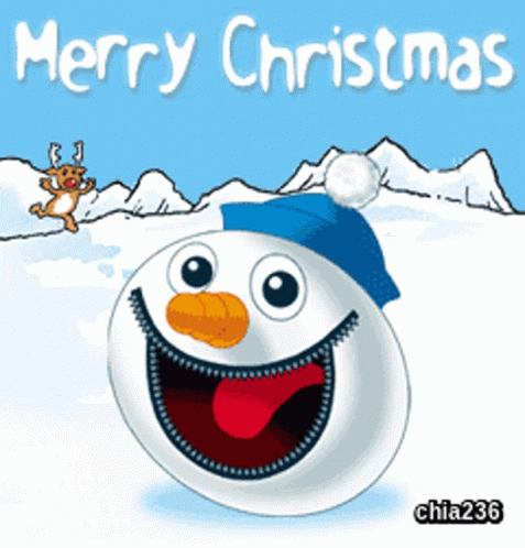 A cheerful cartoon snowman with a wide smile and blue hat wishes 'Merry Christmas' amidst a snowy landscape.