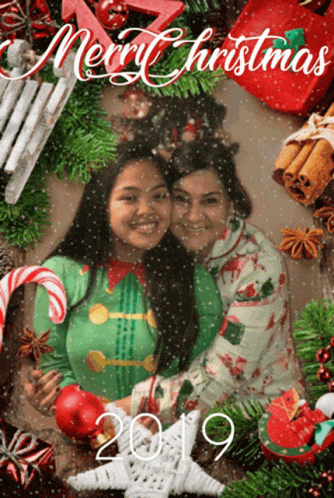 Mother and daughter celebrating Merry Christmas in 2019, surrounded by festive decorations.