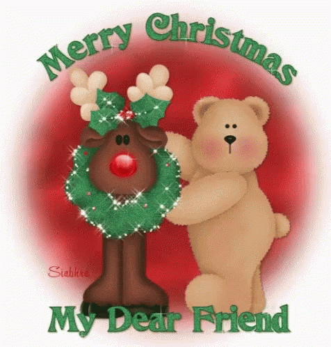 A festive animated greeting featuring a teddy bear hugging a reindeer, wishing a Merry Christmas.