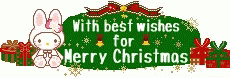My Melody wishes 'With best wishes for Merry Christmas' on a festive green banner with pixel art details.