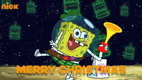 Spongebob Squarepants celebrates Christmas, holding a trumpet with 'Merry Christmas' text.