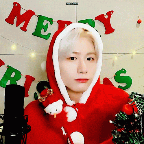 Victon's Kang Seungsik, dressed in a festive Santa outfit, wishes everyone a Merry Christmas.