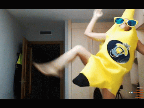 Mery Soldier Platano performs an energetic dance in a banana costume with sunglasses indoors.