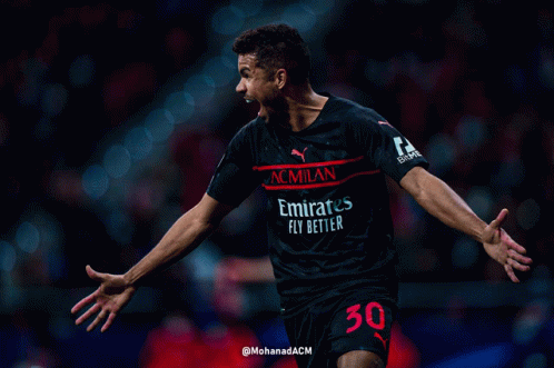 Junior Messias celebrates a goal for AC Milan, wearing the black and red jersey with number 30.