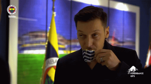 Mesut Özil, the football star, sips from a cup at Fenerbahçe, with the club's flag in the background.