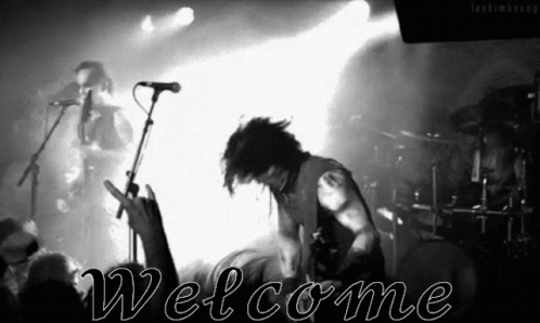A black and white scene of a metal band performing on stage with bright lights and 'Welcome' text.