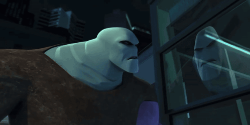 a cartoon character is looking at his reflection in a glass window