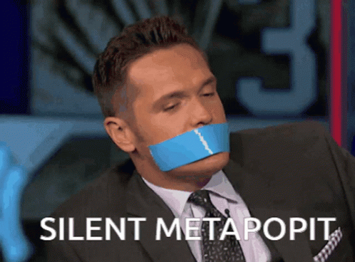 A man in a suit and tie with blue tape over his mouth, featuring the text 'Silent Metapopit'.