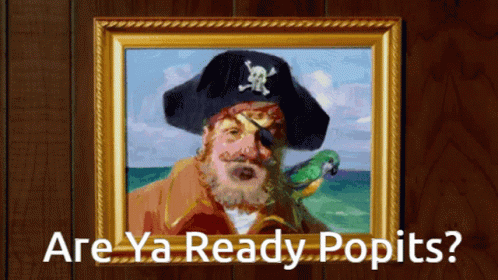 A framed painting of a pirate with an eyepatch and a parrot on his shoulder, asking 'Are Ya Ready Popits?'.