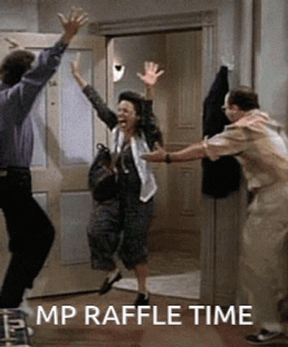 Three excited people jump and cheer, celebrating 'MP Raffle Time' with high-fives and joy.