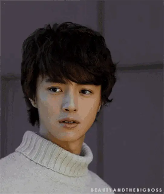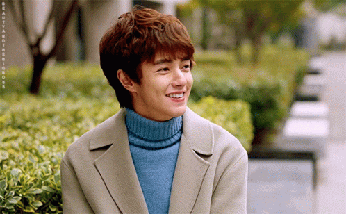 Lei from Meteor Garden smiles brightly, wearing a blue turtleneck and grey coat.