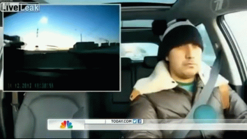Man in a car reacts as a bright meteorite streaks across the sky, captured by a dashcam.