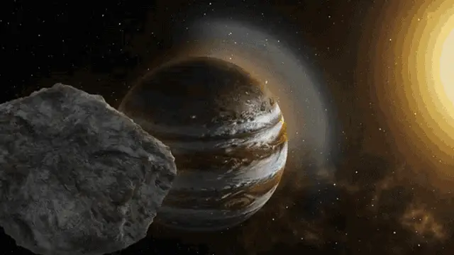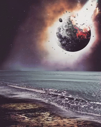 A dramatic artwork depicting a meteorite impact causing a planet to break apart over an ocean.