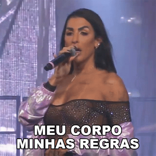 Pepita sings 'Meu Corpo Minhas Regras' (My Body My Rules) into a microphone, advocating for personal autonomy.