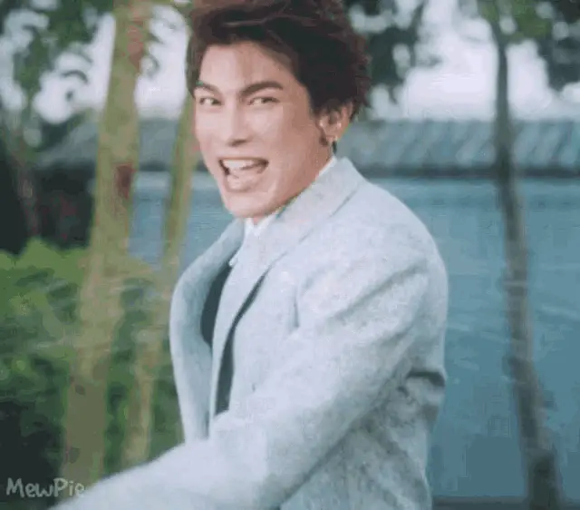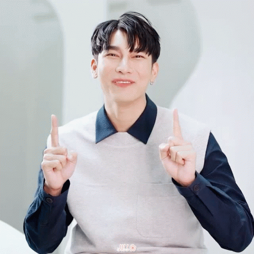 Mew Suppasit smiles brightly, pointing both index fingers up, wearing a stylish grey vest and dark shirt.