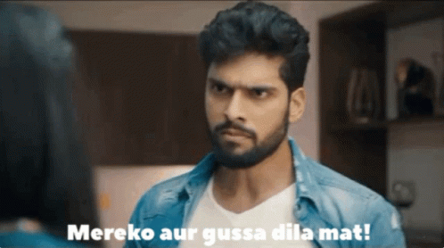 Raghavrao, a man with a beard, angrily says 'Mereko aur gussa dila mat!' (Don't make me angrier!).