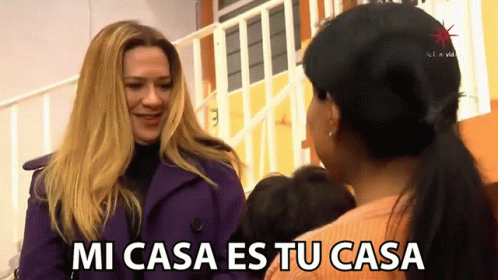 A woman in a purple coat speaks to another, with the Spanish phrase 'Mi Casa Es Tu Casa' displayed.