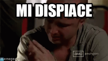A man crying with the words 'Mi Dispiace' (I'm Sorry) displayed, expressing deep regret and sadness.