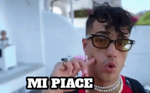 A man, likely from Dark Polo Gang, expresses approval with 'Mi Piace' and a thumbs up, wearing sunglasses and necklaces.