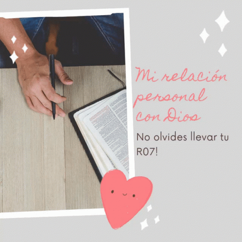 A person's hand with a pen over an open Bible, with text 'Mi relación personal con Dios' and 'No olvides llevar tu R07!'