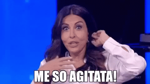 Italian actress Sabrina Ferilli makes a funny face while exclaiming 'Me so agitata!' on a TV show.
