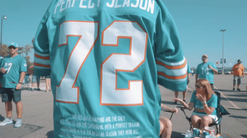 A Miami Dolphins fan proudly wears a jersey celebrating the 1972 'Perfect Season' with the number 72 on the back.