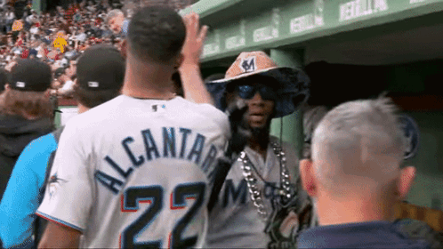 Miami Marlins player Bryan De La Cruz celebrates in the dugout, wearing a large hat, sunglasses, and a chain.