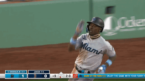 Jazz Chisholm Jr. of the Miami Marlins runs the bases after scoring a point in a baseball game.