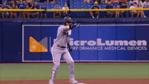 Luis Arraez, a Miami Marlins baseball player, points on the field in front of a MicroLumen advertisement.