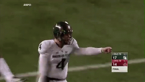 Football player Michael Geiger celebrates a Michigan State victory over Ohio State with his iconic windmill arm motion.