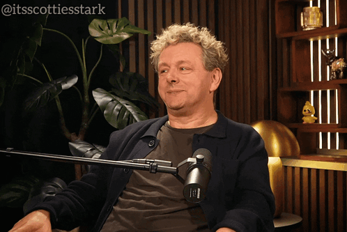 a man with curly hair is sitting in front of a microphone with the hashtag @itsscottiesstark above him