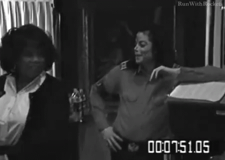 Michael Jackson and Oprah Winfrey dancing and laughing together in a black and white clip.