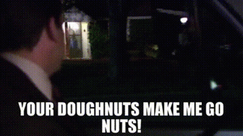 Michael Scott from The Office shouts 'YOUR DOUGHNUTS MAKE ME GO NUTS!' in a car at night.