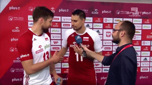 Polish volleyball players Michal Kubiak and Fabian Drzyzga share a handshake during a post-match interview.