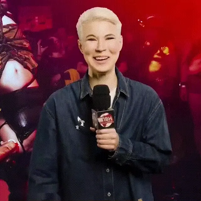 Journalist Michelle Barros presents for Carnaval Globo, standing in front of a vibrant, colorful sign.