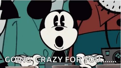Mickey Mouse goes crazy with excitement and love, with hearts and stars in his eyes, exclaiming 'GOING CRAZY FOR YOU'.