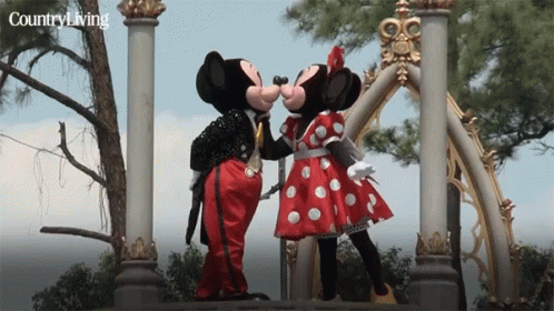 Mickey Mouse and Minnie Mouse share a sweet kiss on stage at a Disney park, delighting fans.