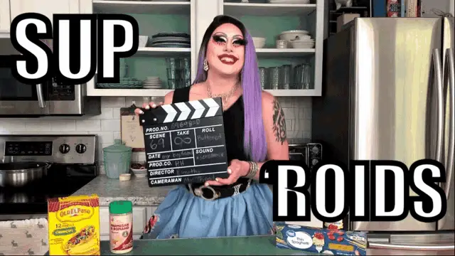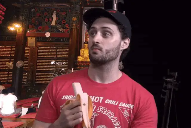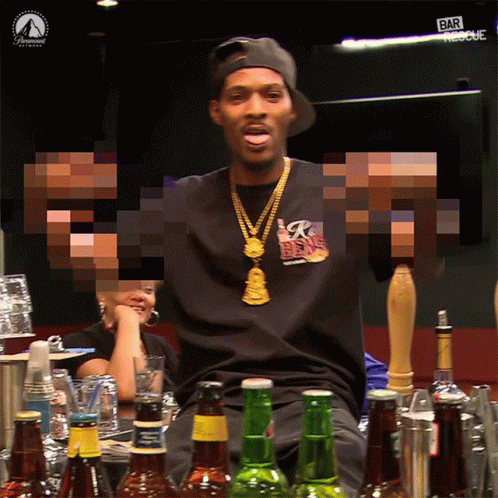 A man wearing a 'Rob Bens' shirt and a hat makes a pixelated middle finger gesture while sitting at a bar on Bar Rescue.