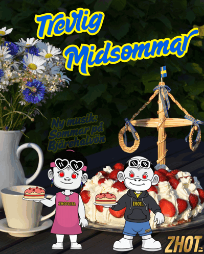 a cartoon of a boy and a girl holding pancakes in front of a cake with strawberries and whipped cream