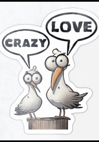 Two cartoon seagulls, one saying "CRAZY" and the other "LOVE", in a whimsical illustration.