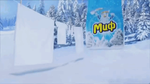 A bag of "Миф" (Myth) washing powder with a snowman logo, set against a snowy, winter wonderland backdrop.
