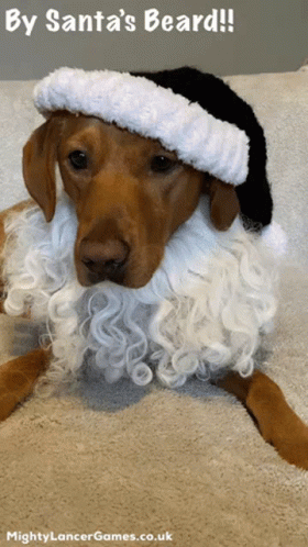 Mighty Lancer Mlgdog, a festive pup, dressed as Santa Claus with a hat and beard, exclaiming 'By Santa's Beard!!'.