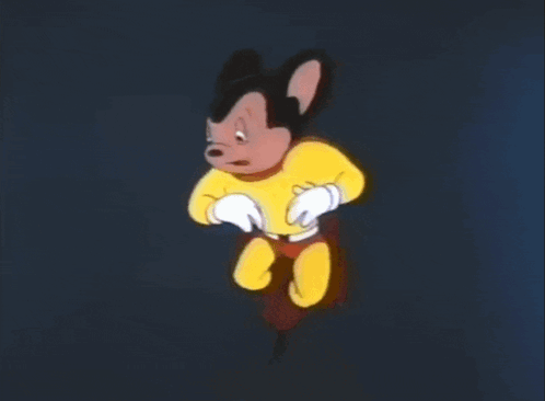 Mighty Mouse, also known as Super Raton, flies through the air in his iconic superhero costume.
