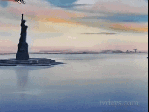 Mighty Mouse, the superhero mouse, flies swiftly over a city skyline and a body of water.